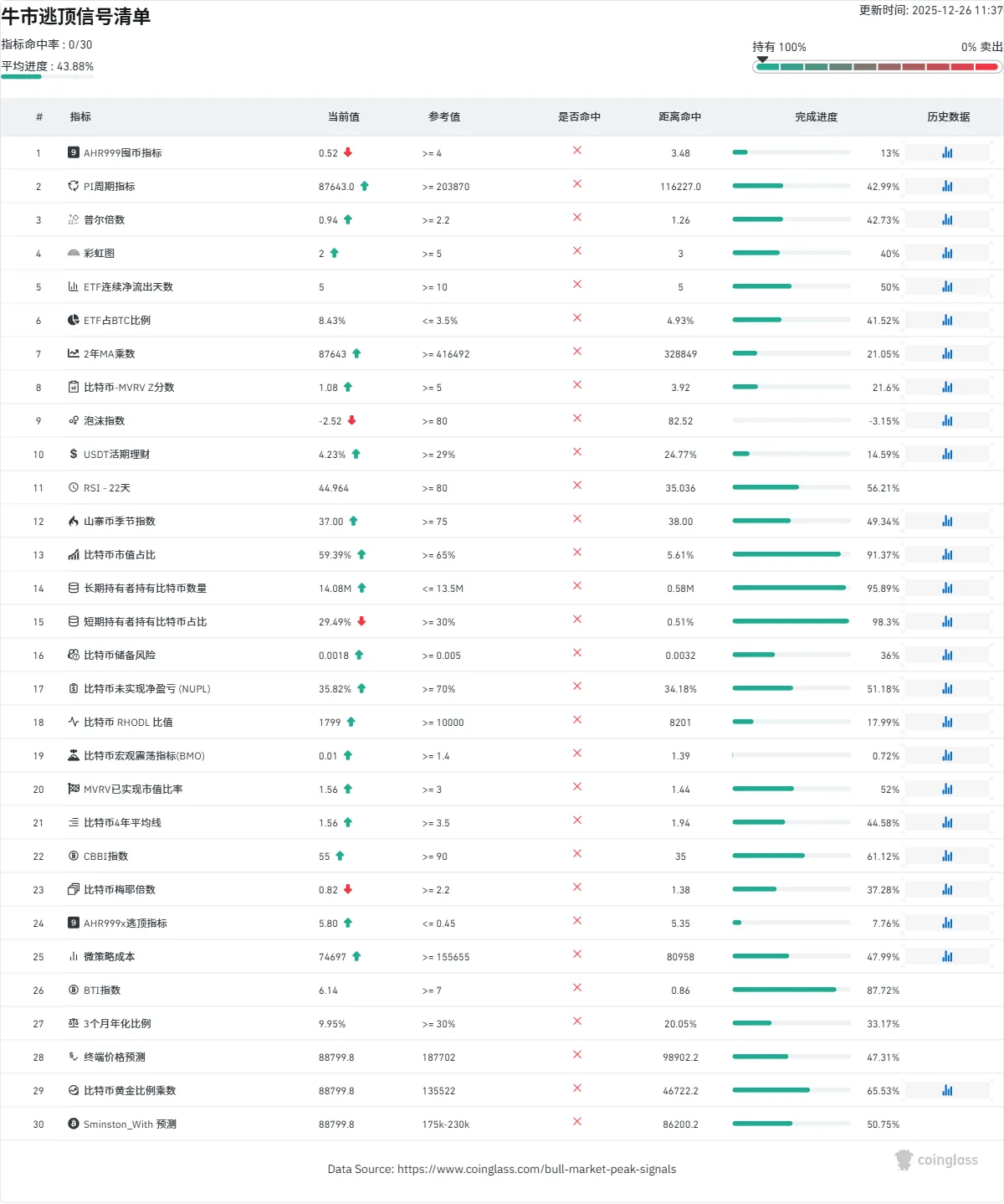 本周逃顶指标未触发报警,但短期 BTC 持有者占比显著升高,已接近预警阈值,需警惕短期回调风险。从资金费率来看,本周多数山寨币仍为负费率,但整体呈现边际改善趋势,市场投机情绪有所回暖。