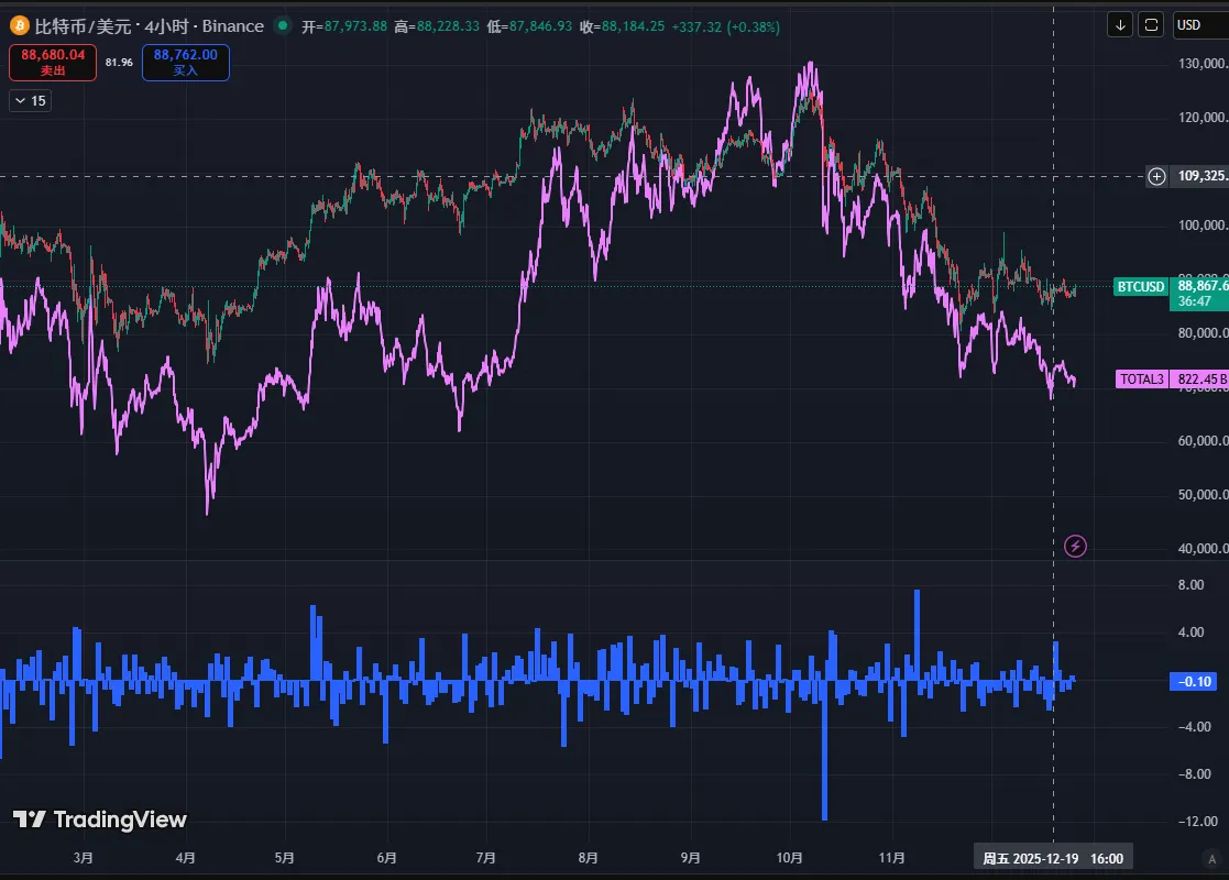 本周五 TOTAL3(剔除 BTC、ETH 后的全代币市值)达 8223 亿美元,环比上涨 1.95%。本周 BTC 在 88000 美元区间窄幅震荡,波动率处于低位。尽管美股与 A 股持续反弹,但 BTC 未跟随联动,商品市场表现强势。从资金流向来看,BTC 在传统金融配置体系中仍处于后排,在缺乏明显增量资金的情况下,大概率维持区间震荡。
