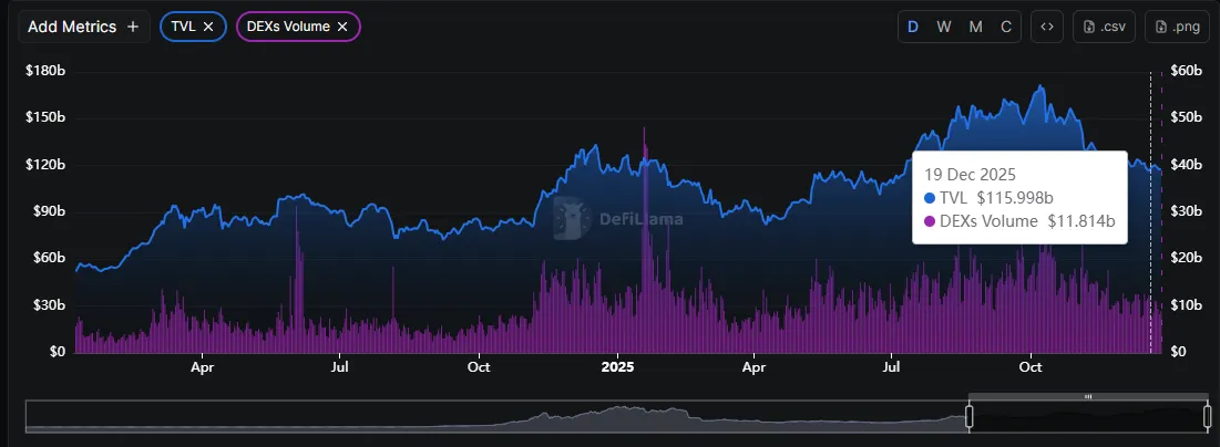 链上总 TVL 达 1175 亿美元,环比上涨 1.29%,整体呈震荡态势。ETH 质押数量保持稳定,趋势上呈现震荡走高格局,反映出长期持有者信心相对稳固。