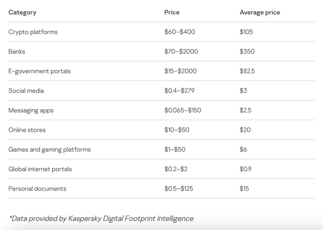 下表展示了截至2025年在暗网论坛上发现的各类账户售价示例*。