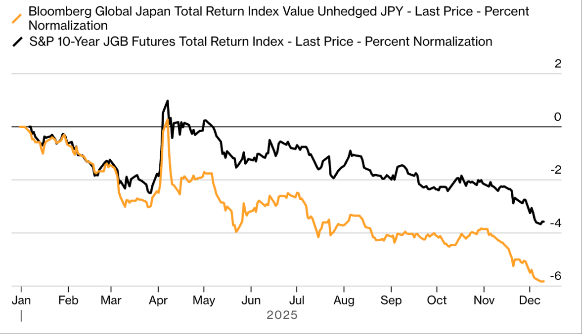 今年,「寡妇制造者」摇身变为「造雨人」:日本基准政府债券收益率全面飙升,让规模达 7.4 万亿美元的日本国债市场成为「做空者的天堂」。触发因素多种多样:日本央行加息、首相高市早苗推出「疫情后最大规模支出计划」。基准 10 年期日本国债收益率突破 2%,创数十年新高;30 年期国债收益率上涨逾 1 个百分点,刷新历史纪录。截至 12 月 23 日,彭博日本国债回报指数今年下跌超 6%,成为全球表现最差的主要债券市场。