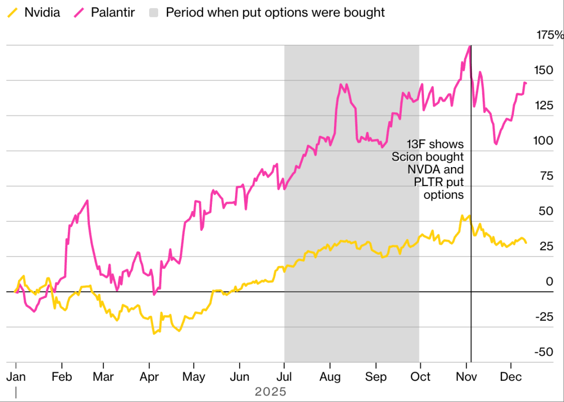 这笔交易在一份例行披露文件中曝光,但其影响却绝非「例行」。11 月 3 日,赛昂资产管理公司(Scion Asset Management)披露,持有英伟达(Nvidia)和帕兰提尔科技(Palantir Technologies)的保护性看跌期权 —— 这两家公司是过去三年推动市场上涨的「人工智能核心股」。尽管赛昂并非规模庞大的对冲基金,但其管理者迈克尔・伯里(Michael Burry)让这份披露备受关注:伯里因在《大空头》一书及同名电影中「预言 2008 年次贷危机」而声名鹊起,成为市场公认的「预言家」。