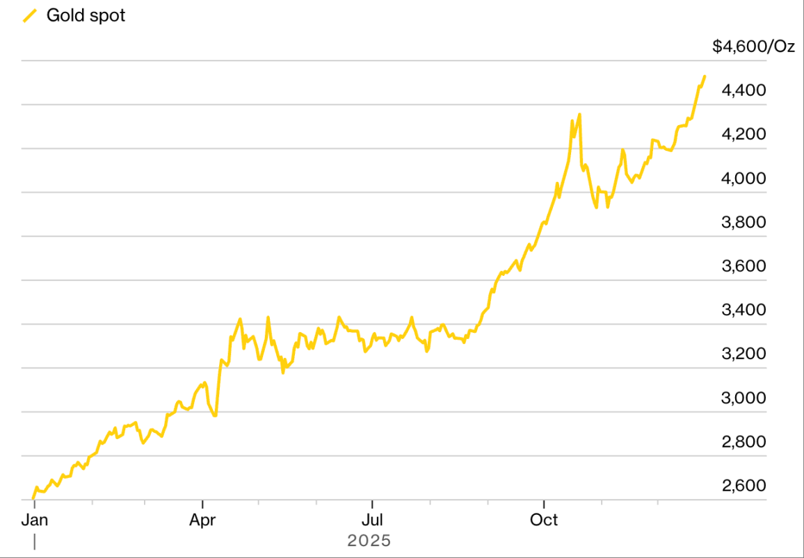其他资产的价格走势则呈现分化:铜、铝甚至白银等金属的波动,一半源于「对货币贬值的担忧」,另一半则受特朗普关税政策和宏观力量驱动,这模糊了「通胀对冲」与「传统供应冲击」的界限。与此同时,黄金持续走强,不断刷新历史新高。在这一领域,「贬值交易」依然有效 —— 但它不再是对「法定货币的全面否定」,更多是对「利率、政策与避险需求」的精准押注。