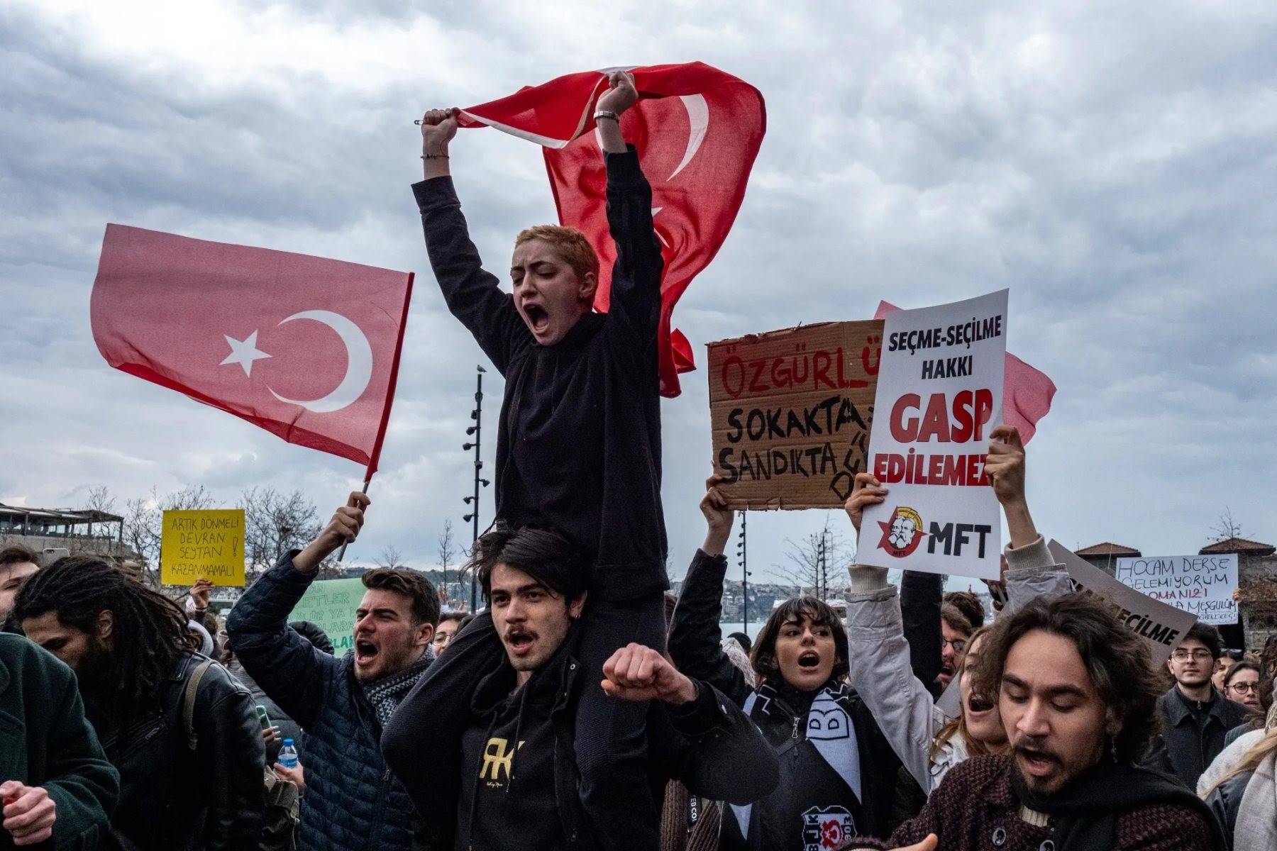 伊斯坦布尔市长埃克雷姆·伊马姆奥卢被拘留后,大学生们在示威活动中手持土耳其国旗和标语。摄影:凯雷姆·乌泽尔 / 彭博社