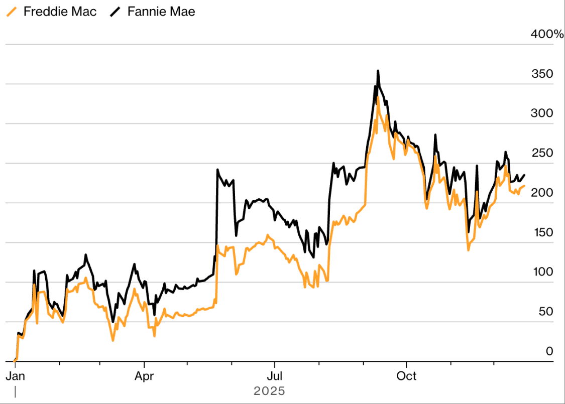 特朗普连任改变了这一局面:市场乐观预期「新政府将推动两家公司脱离管控」,房利美与房地美的股票瞬间被「Meme 股式热情」包围。2025 年,热度进一步升温:从年初到 9 月高点,两家公司股价暴涨 367%(盘中涨幅达 388%),成为今年最亮眼的赢家之一。