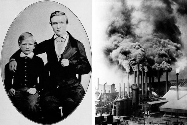 左圖:少年安德魯·卡內基和他的弟弟。右圖:鍍金時代匹茲堡的鋼鐵廠。