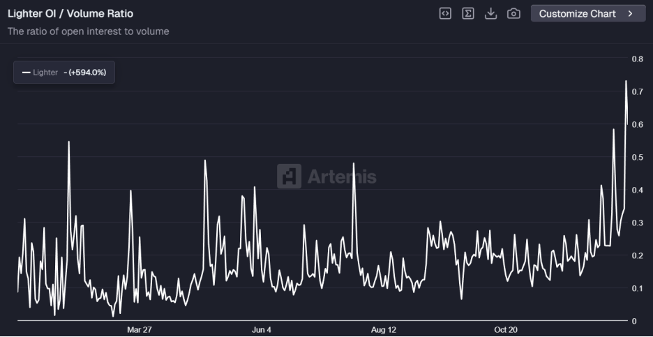 協議誇張的 OI/Vol (持倉量/交易量) 比率引發了市場廣泛的質疑。 雖然近日比率有所回升,但 Lighter 曾長期維持著 0.2 上下的比率,這意味著平均每 1 美元的持倉在 24 小時內被反覆交易了 5 次左右,顯著背離了健康的有機持倉模式 (OI/Vol<0.33),表現出明顯的刷量特徵。