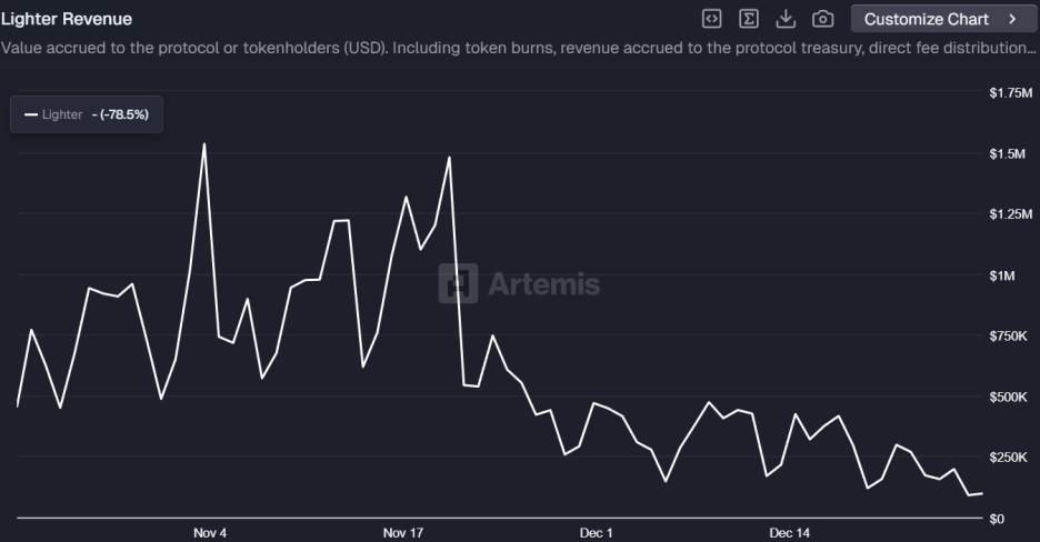 然而,或因市場下行,Lighter 近一週的收入水平有所下滑。代幣空投預期已兌現,協議的真實創收能力仍有待觀察。