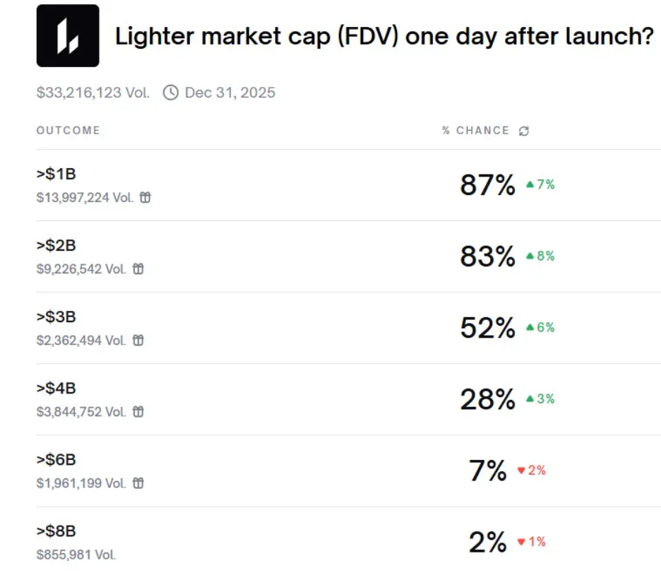 CoinGecko 數據顯示,LIT 目前市值約 6.8 億美元,FDV (全稀釋估值) 超 27 億美元。一週前,Polymarket 盤面預測「Lighter 上線次日市值將超 20 億美元」的機率達 83%。
