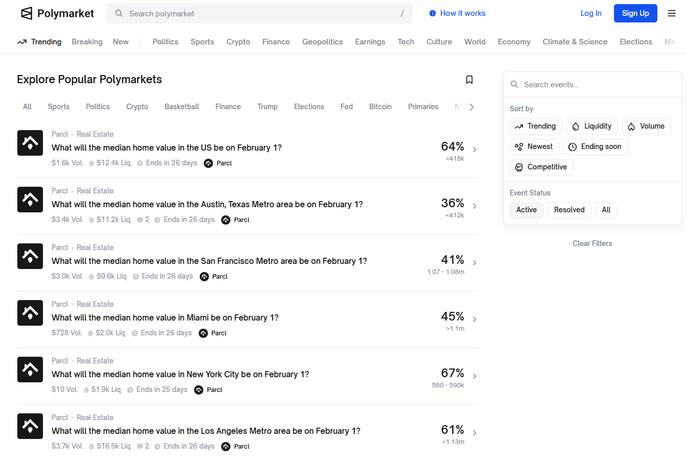 Polymarket CMO Matthew Modabber 表示:“预测市场最适合那些有清晰、可验证数据的事件。Parcl 的每日房价指数为我们提供了透明、一致的结算基础,房地产应成为预测市场的一级类别。”