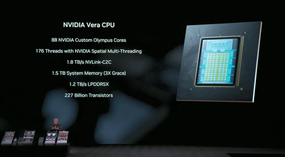 Vera CPU: 为数据移动和智能体处理而设计,拥有88个英伟达定制Olympus核心、176线程的英伟达空间多线程,1.8TB/sNVLink-C2C支持CPU:GPU统一内存,系统内存达1.5TB(是Grace CPU的3倍),SOCAMM LPDDR5X内存带宽为1.2TB/s,并支持机架级机密计算,数据处理性能翻倍提升。