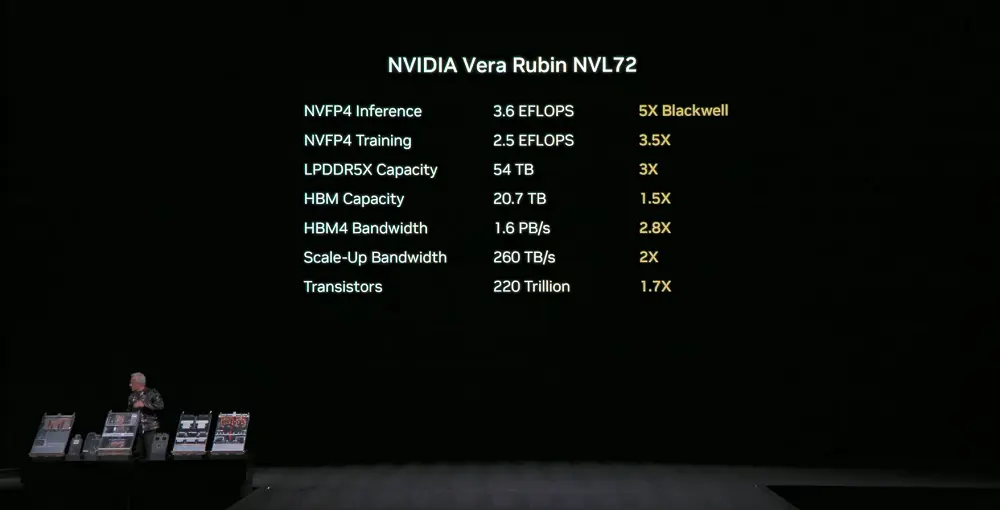 NVIDIA Vera Rubin NVL72: 在系统层面将上述所有组件整合成单机架处理系统,拥有2万亿颗晶体管,NVFP4推理性能达3.6EFLOPS,NVFP4训练性能达2.5EFLOPS。