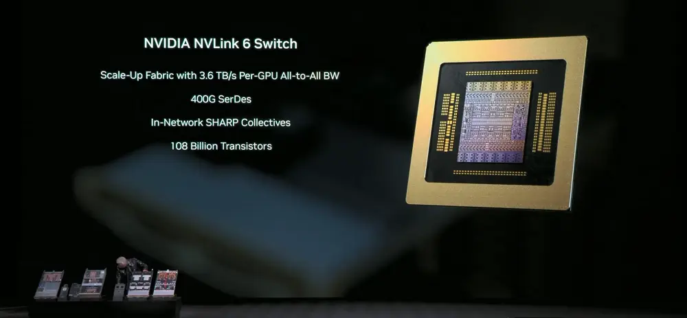 NVLink 6 Switch: 单lane速率提升至400Gbps,采用SerDes技术实现高速信号传输;每颗GPU可实现3.6TB/s的全互连通信带宽,是上一代的2倍,总带宽为28.8TB/s,FP8精度下in-network计算性能达到14.4TFLOPS,支持100%液冷。