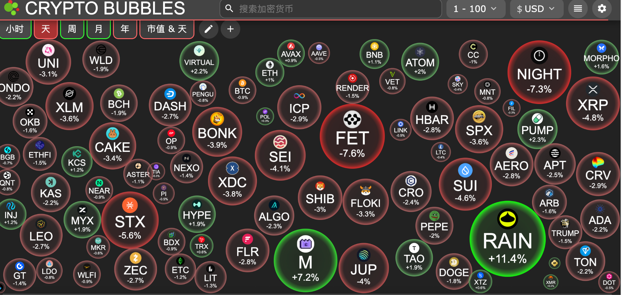 今日市值前100币种最大涨幅: Rain涨11.3%、MemeCore涨7.1%、Pump.fun涨2.3%、Virtuals Protocol涨2.2%、Cosmos涨2%。