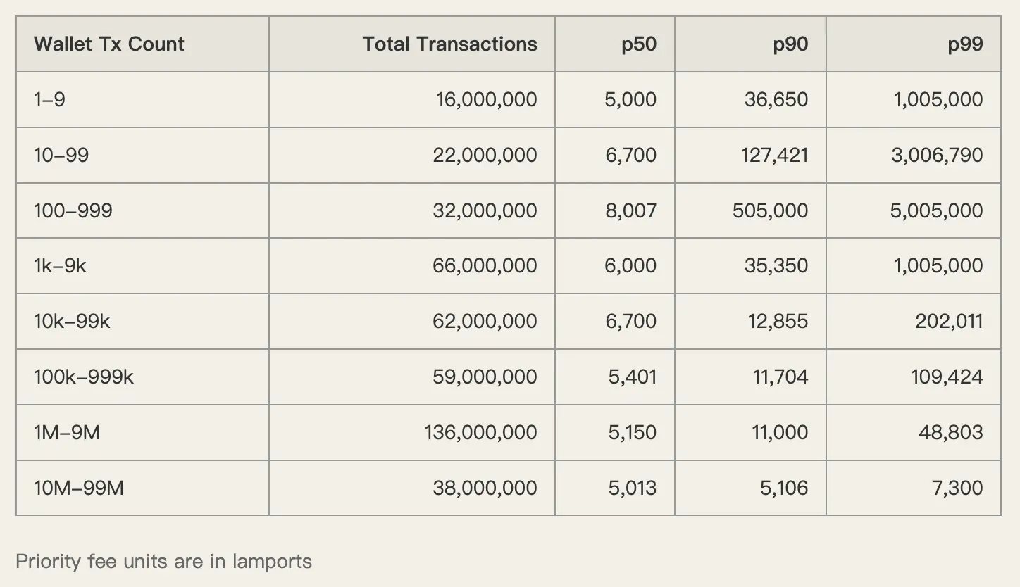 数据显示,Axiom 用户支付的优先费中位数(p50)高达 1,005,000 lamports。作为对比,高频交易钱包仅支付约 5,000 到 6,000 lamports。这中间是 200 倍的差距。