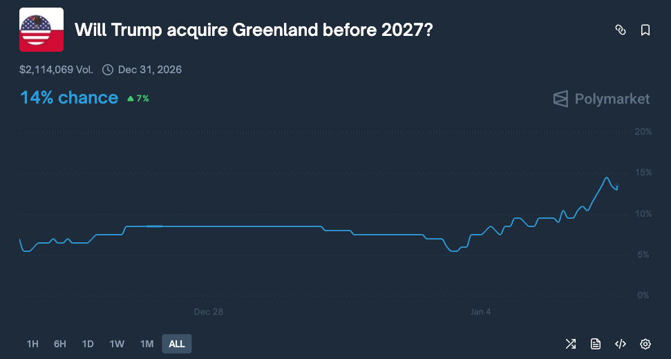 在 Polymarket 上,“特朗普 2027 年前‘收购’格陵兰岛”的市场敏感度很高。 该市场概率从 12 月 28 日的约 7%上升至目前的 14%,涨幅达 7 个百分点 ,交易量突破 210 万美元。这一上涨时间点也与委内瑞拉行动重合。