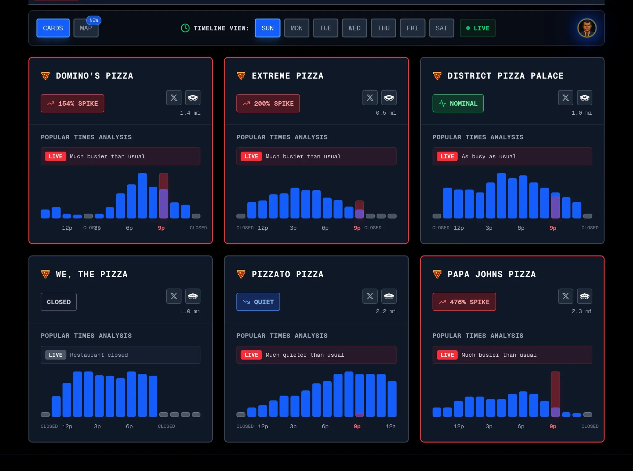 本周日晚间的最新数据显示, 距离五角大楼 2.3 英里的 Papa John's 披萨店活动量激增 476%,而更近的 Extreme Pizza 增幅达 200%。 而最高点相较最低点的 1250% 增幅创下了历史新高。