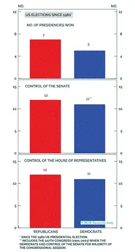 如果 GDP 和油價一起上漲,那贏的是藍隊民主黨;如果 GDP 上漲、但油價橫盤或下跌,那贏的就是紅隊共和黨。