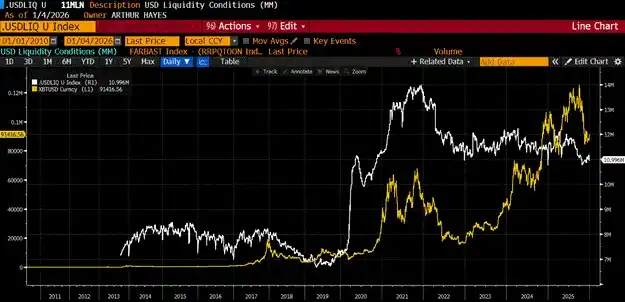 比特幣(數位黃金)的上漲,直接源於印鈔。這一點可以從我建構的美元流動性條件指數中清楚地看到(Bloomberg 代碼:.USDLIQ U Index)。