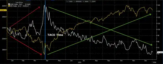 如果你還記得,當時川普威脅要徵收極高的關稅,高到足以真正削減全球貿易和金融流動失衡——這在宏觀上將是高度通縮性的。市場應聲暴跌,MOVE 指數盤中一度飆升至 172 的高點。