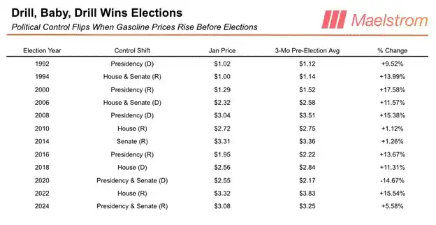 「10% 規則」:如果在選舉前三個月,全國汽油平均價格相較於同一自然年 1 月的平均水準上漲 10% 或以上,那麼政府的一個或多個權力分支,往往會發生政黨輪替。