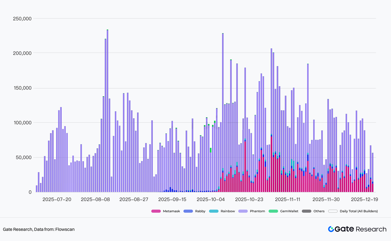 Hyperliquid Builder Codes 则是与钱包双向奔赴的关键点。它允许第三方应用(如交易终端、钱包)通过自定义代码中继交易到 Hyperliquid 的 HyperCore 层,用户无需直接访问 Hyperliquid 界面,即可在钱包内签名并执行交易。对于 Hyperliquid 来说,Builders 显著提升了其分发能力;对于钱包同样带来了显著的价值,钱包无缝集成 Hyperliquid 的全部市场(包括 HIP-3 无许可部署的新 Perp 对),无需自己构建订单簿或流动性;通过 Builder Codes 赚取路由分成/手续费份额,同时保留非托管核,资金始终在用户钱包,直至结算。Phantom 正是通过此模式直接接入 Hyperliquid,快速捕获衍生品流量,并成为捕获费用能力最强的 Builders——自今年 7 月上旬上线至今已捕获了超过 1,260 万美元费用收入。其他钱包如 Rabby、Metamask 和 Rainbow 等陆续集成 Hyperliquid Builders,让用户直接在钱包应用内交易永续合约。