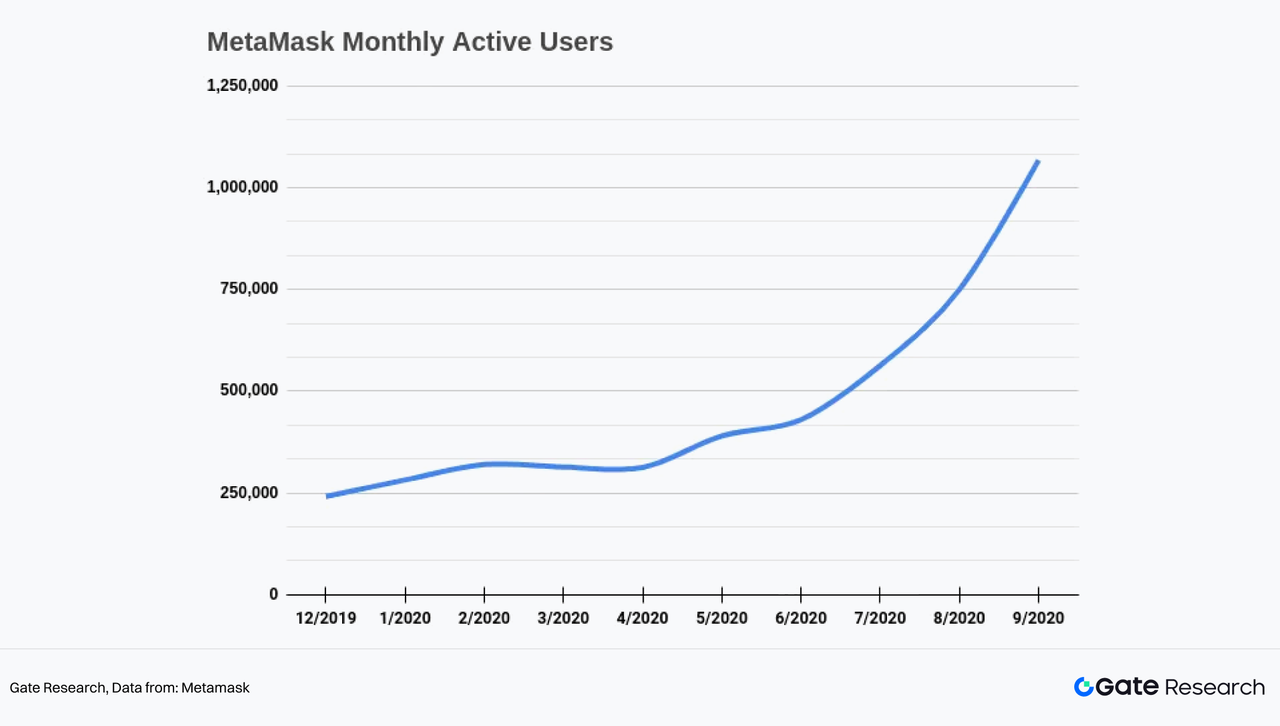 DeFi Summer 前,钱包主要用于简单转账、资产查看和少量 dApp 交互,用户规模有限。2020 年夏季,随着 DeFi 协议的爆发,用户必须直接通过钱包与智能合约交互(签名交易、授权额度、存取流动性等),钱包从“可选工具”一跃成为进入 DeFi 的强制网关。 最典型的体现是 MetaMask 的使用数据爆炸式增长。