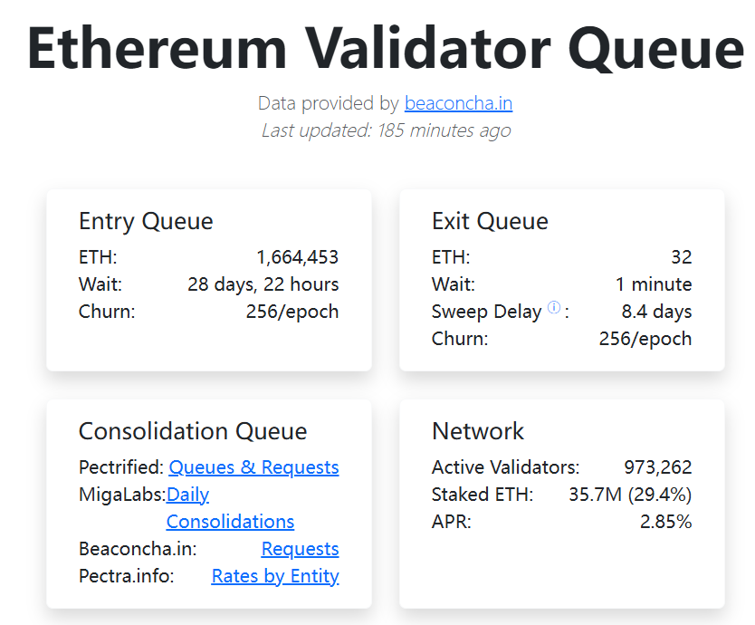 根 據驗證者隊列追蹤網站 validatorqueue.com 最新數據 顯示 ,以太坊(Ethereum)質押網路的進入隊列(entry queue)等待激活的 ETH 數量已大幅上升,達到約 1,664,453 枚,價值約 52 億美元。這導致新驗證者激活延遲時間長達約 28 天 22 小時,顯示質押需求強勁,隊列出現明顯擁堵。