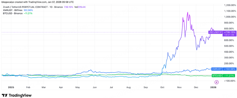 從市場層面看,2025 年下半年隱私賽道出現了明確的階段性回暖。以 Zcash、Monero 為代表的傳統隱私資產整體跑贏市場,其中 Zcash 年內最高漲幅接近 1100%,市值一度超過 Monero,反映出市場對可選隱私與合規彈性的重新定價。與此前隱私幣主要作為小眾對沖資產不同,這一輪回暖更多體現為對隱私基礎設施長期價值的再評估。