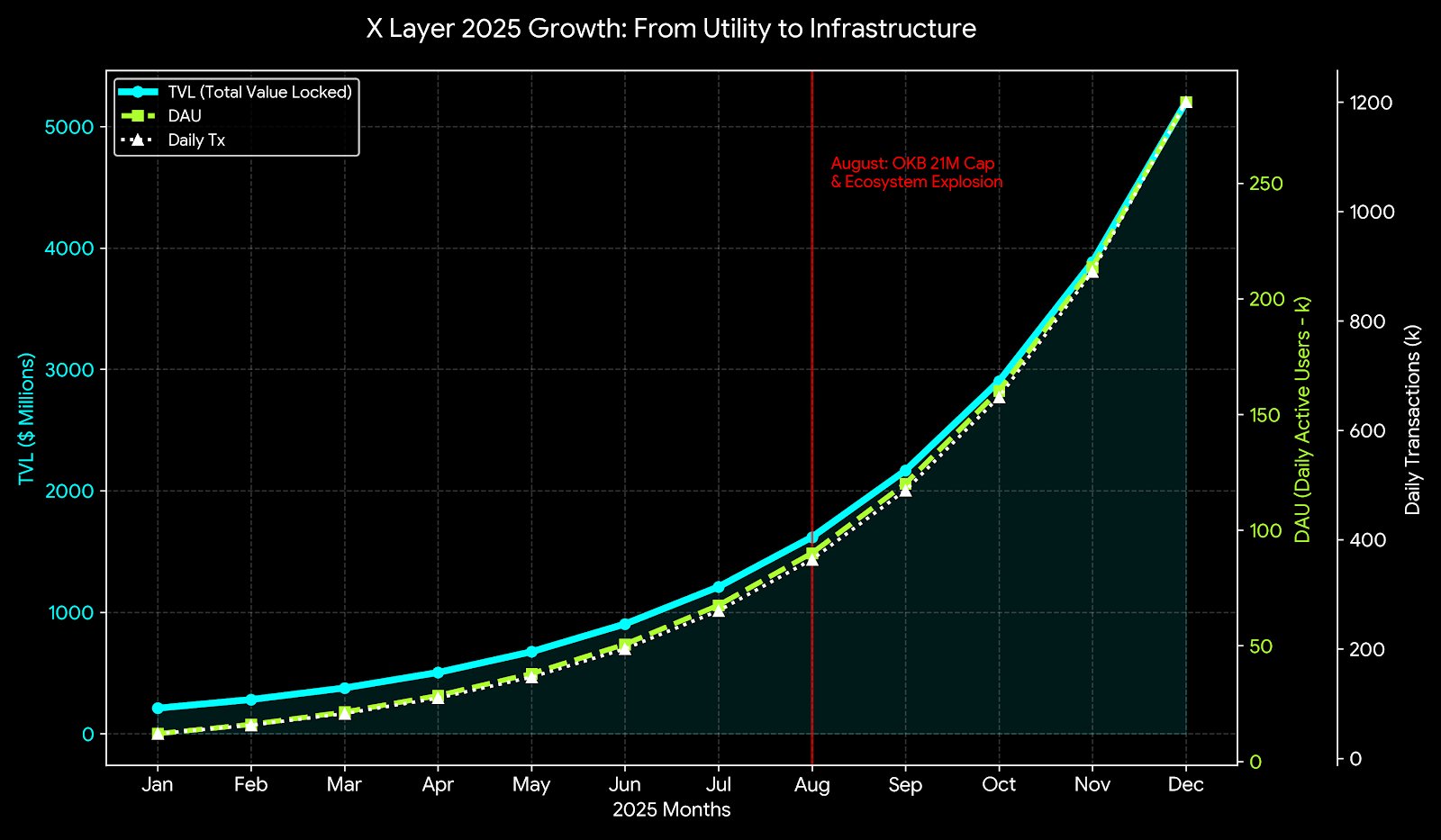 截至2025年底,X Layer累计独立地址数超过200万。其中,日活跃DAU地址在11月和12月保持在28万左右的高位,TVL维持在5b,这主要得益于年底的交易所营销活动及新的Meme币上线。