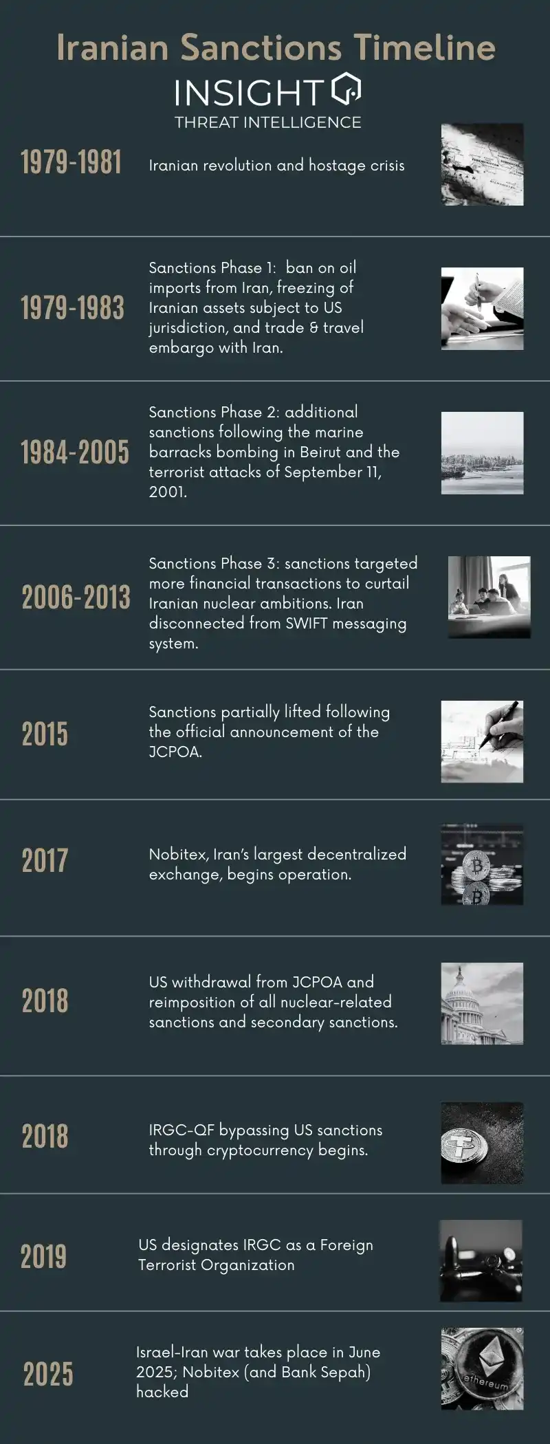 自 2018 年起,伊朗开始将加密货币用于规避美国制裁。伊斯兰革命卫队(IRGC)是其中的关键使用者之一,利用加密货币为情报活动及其遍布中东的代理网络提供资金,同时也支持对外干预行动,例如破坏活动、财产损毁,甚至可能包括定点暗杀。