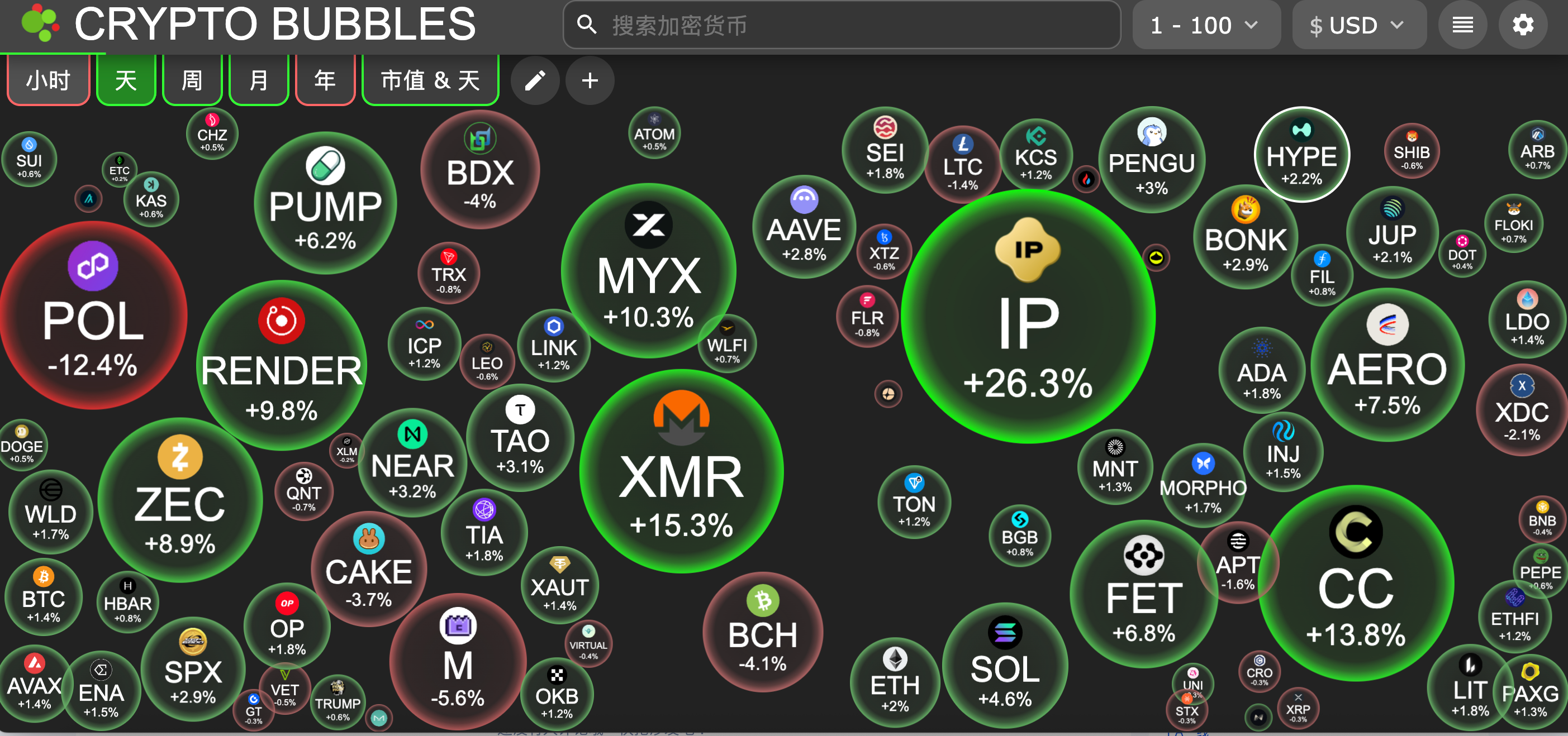 今日市值前100币种最大涨幅:Story涨26.3%、Monero涨15.3%、Canton Network涨13.8%、MYX Finance涨10.3%、Render涨9.8%。