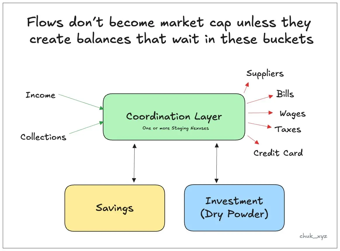 第一个余额层级是 协调(周转)层 。它由暂存节点构成,即资金在“接收”与“支出” 之间 停留、等待下一步操作的地方。对于零售用户,它是支票账户或钱包;对于企业,它是必须备好用于支付工资、供应商款项和税款的运营现金;对于机构,它是与资本市场挂钩的运营流动性:预付余额和库存。暂存节点不一定是银行账户(肯尼亚移动支付的浮存金表明,即使零收益,钱包也能留存可观的余额)。