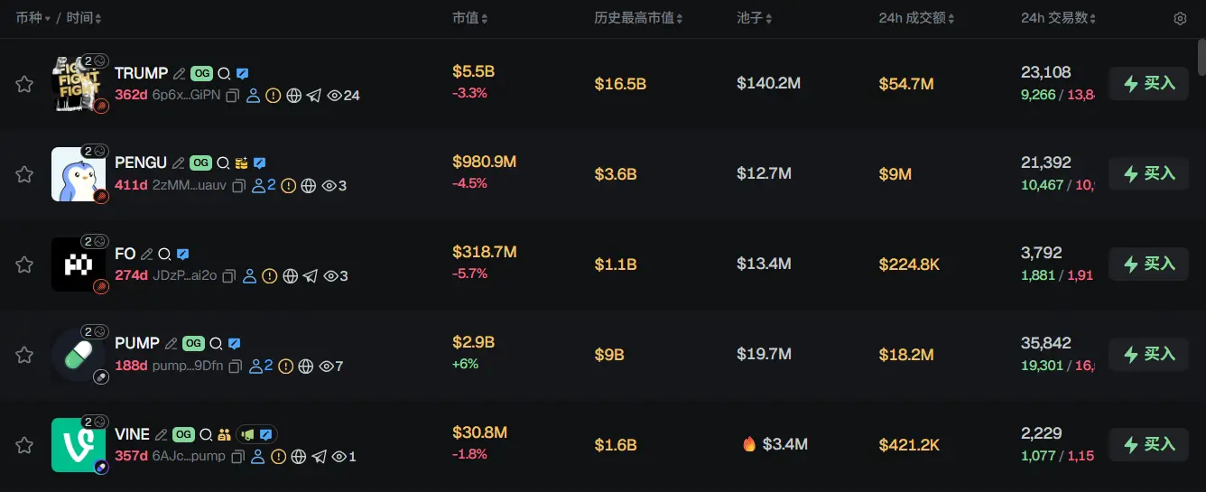 过去 24h Solana 热门代币前五依次为:TRUMP、PENGU、FO、PUMP、VINE