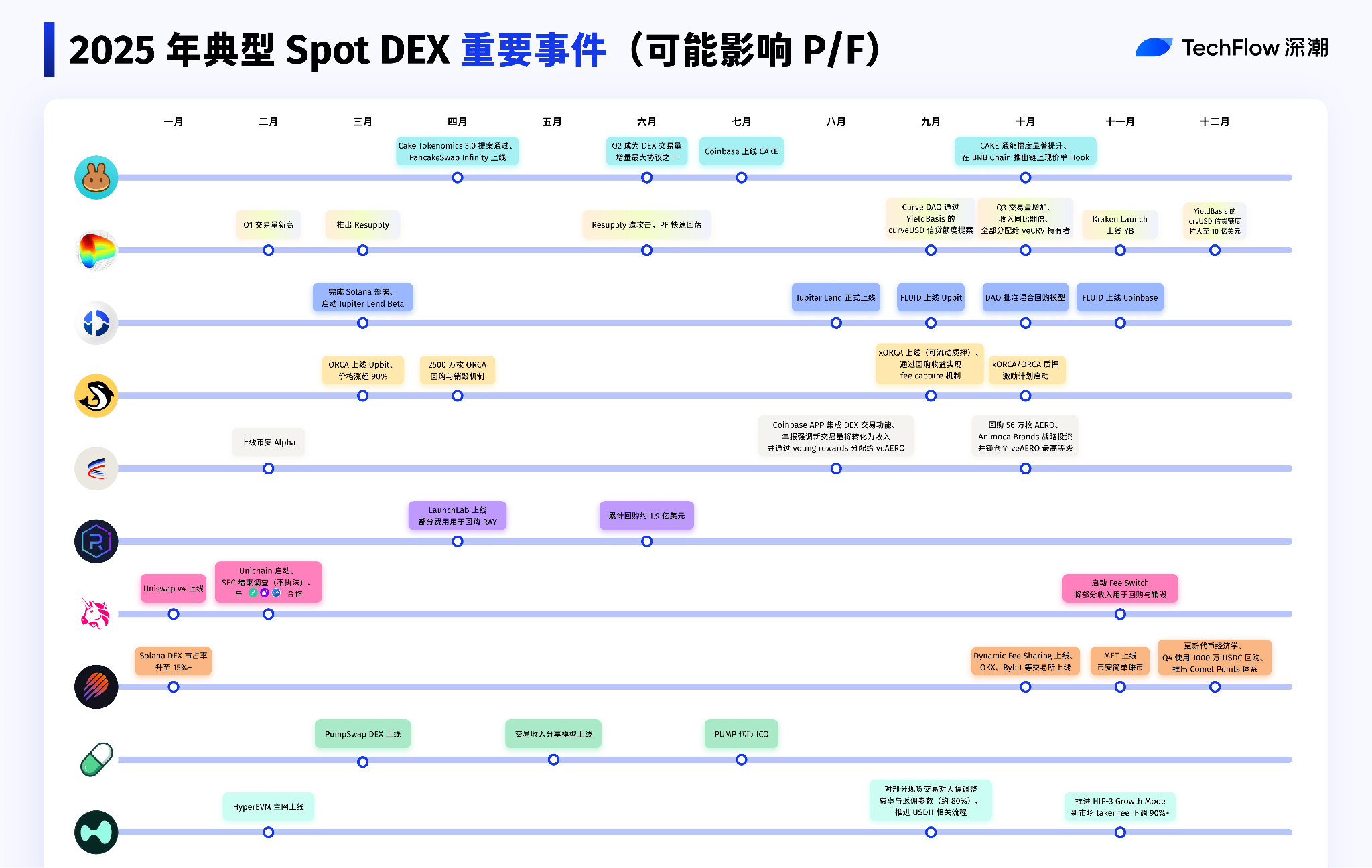 针对于上图协议在 2025 年 P/F 的变动,我们梳理了前十大 Spot DEX 中对于 P/F 变化有一定影响的重要事件,以此希望能帮助你回顾 2025 年这一充满创新与活力的赛道。