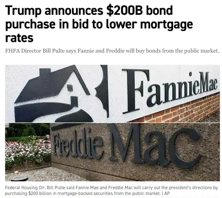 特朗普是个地产商人,他知道如何为房产融资。他的新命令是让房地美和房利美(「两房」)动用其资产负债表上的资本购买 2000 亿美元的抵押贷款支持证券(MBS)。这是美元流动性的净增加。如果成功,特朗普不会止步于此。通过降低抵押贷款利率来推高房市,将让美国人能够通过房屋净值贷款。这种财富效应会让选民在投票日心情大好,转而支持共和党。更重要的是,这创造了更多信用去购买金融资产。