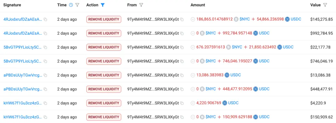 北京时间1月13日,纽约前市长 EricAdams在社交媒体上宣布推出NYC代币(代币合约地址为Ho5fkxk9uqUuVN5kt7TUFacduWCpKPAuYkM9HD3KAXA2)。但代币上线30分钟后,流动性池的创建地址9Ty4M4t9MZArhJBKFWbYrzeqdMf2Ua5eHWSRW3LXKyGt陆续移除流动性: