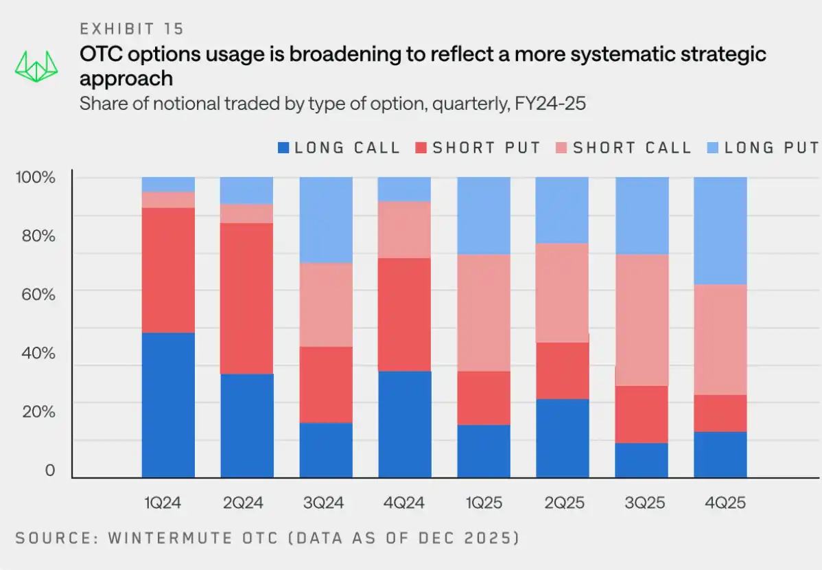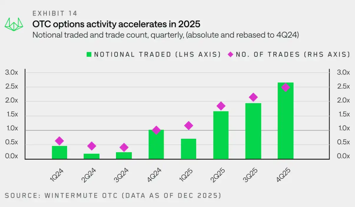 在先前差價合約和期貨活動升溫的基礎上,Wintermute 場外數據顯示,**交易對手方越來越多地轉向期權,以構建更定制化、更複雜的加密資產敞口。**