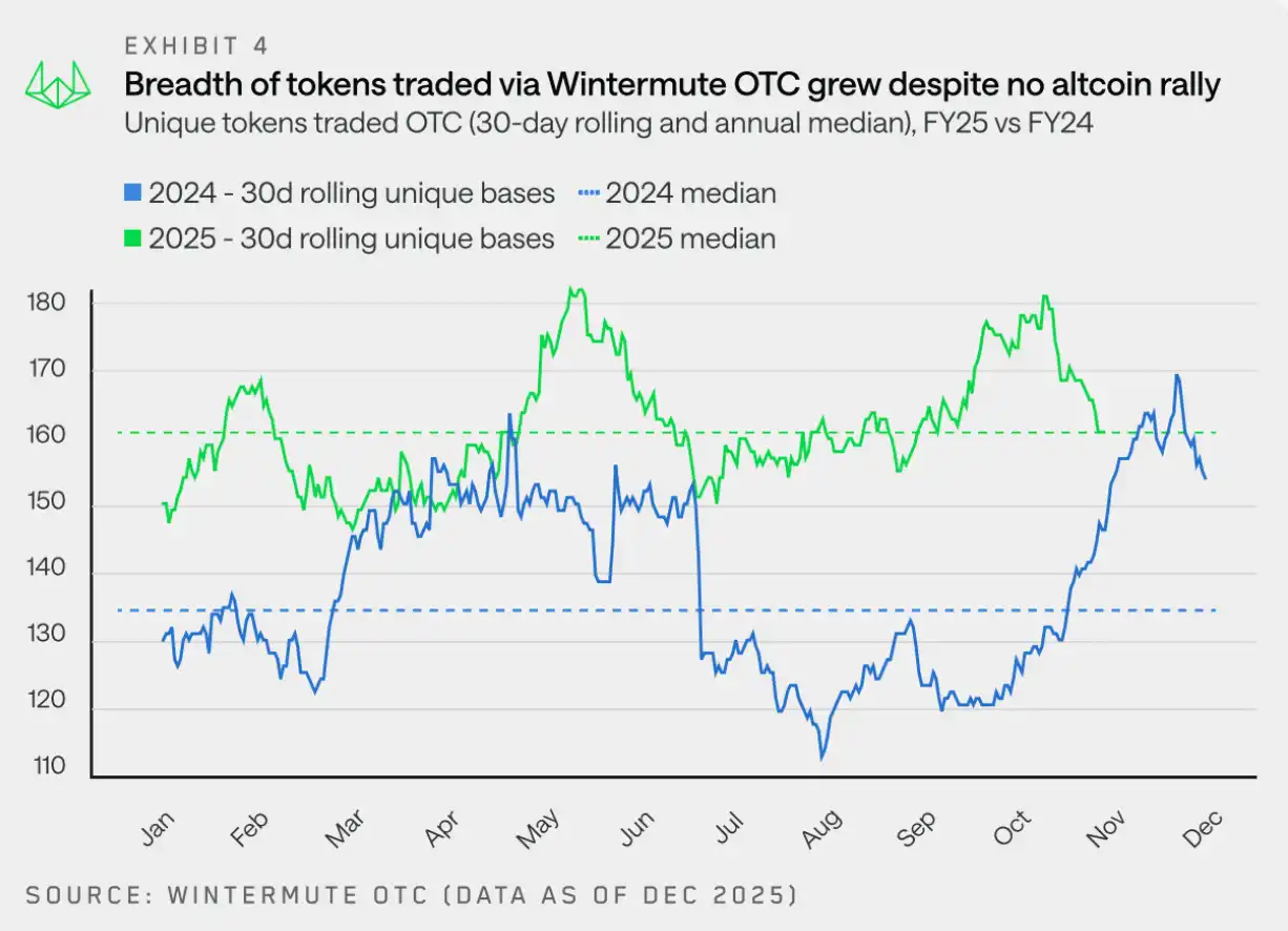 2025 年,交易的代幣總數整體保持平穩。然而,若基於 30 天滾動數據去看,Wintermute 平均交易了 160 種不同代幣,高於 2024 年的 133 種。這表明場外交易活動擴展到了更廣泛且穩定的代幣範圍。