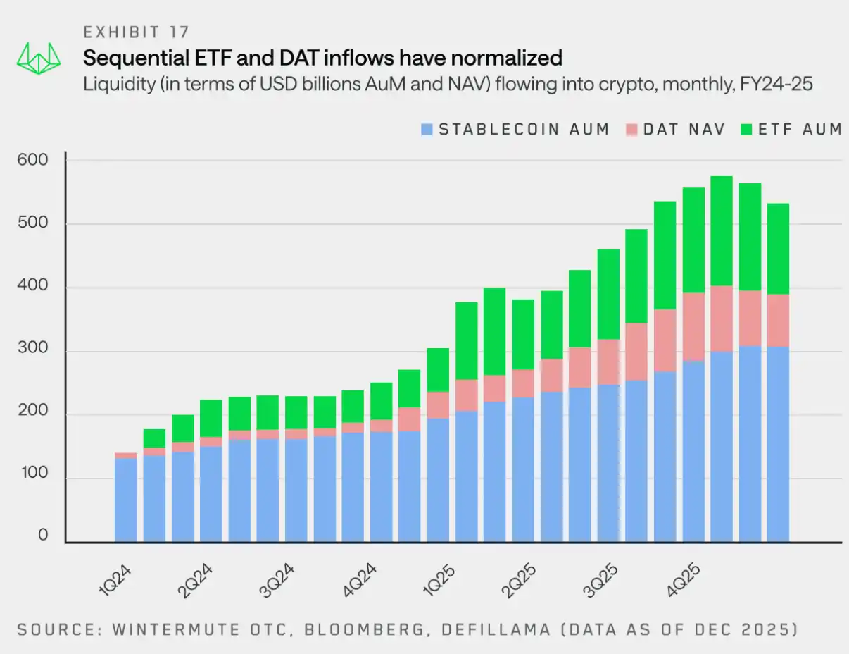 今年早些時候,我們將加密流動性歸納為三大核心支柱:穩定幣、ETF 和 DAT。它們共同構成了資本流入加密市場的主要通道。