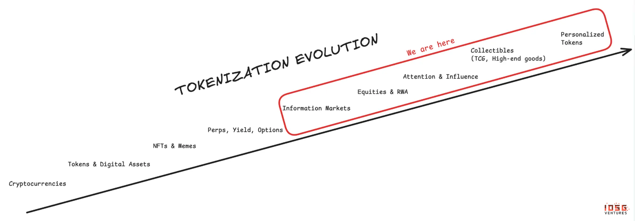 互联网资本市场:代币化的终局: 区块链技术实现了单一的、可编程的全球账本,资本全天候流动,代币化使任何资产都能被识别、交易并即时跨境结算。代币化的演进经历了不同的元周期:从最初的加密货币,到代币(如山寨币和数字资产),再到NFT和Meme币,接着是信息市场(预测市场),以及目前涵盖股票、RWA以及广泛的金融衍生品。展望未来,前沿领域包括收藏品(如集换式卡牌游戏和高端商品)、注意力和影响力市场,最终是个人化代币。随着每个新元叙事出现,专业化交易基础设施随之跟进。加密交易格局已从基础的比特币交易所(Binance、OKX、Coinbase、火币)演进至链上DEX(Uniswap)和聚合器(1inch、0x),再到NFT市场(OpenSea)和终端(Blur),Meme代币发射台(Pump.fun)和终端(Axiom、GMGN、FOMO),PerpDEX(Hyperliquid、Lighter)及其新兴终端和聚合器,以及预测市场平台(Polymarket、Kalshi)及其自身的新兴终端基础设施。每个元叙事都需要专门为追求简洁的散户用户和需要高级功能的专业用户量身定制的界面。当前这一代(聚焦永续合约和预测市场)产品,随着市场成熟并与传统金融整合,呈现出重要的风投机会。