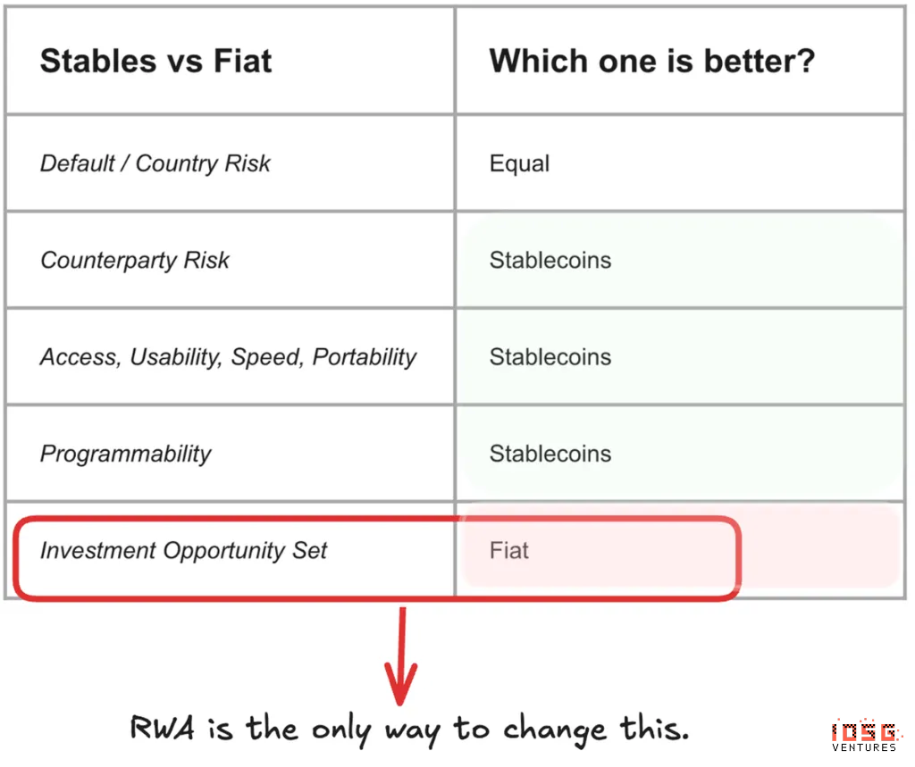 稳定币:几近完美的货币,只差一个关键环节: 稳定币在几乎所有维度上都已被证明优于传统法币。相比传统支付轨道,它们在可及性、易用性、速度、便携性和可编程性方面都具有优势。交易对手风险与传统银行业相当,而技术本身提供了明显优势。然而,存在一个关键局限:相比法币,稳定币的投资选择仍然受限。传统金融市场提供了广阔的生产性投资机会——股票、债券、房地产和另类资产。稳定币尽管技术优越,仍受限于加密原生的收益来源和投资机会,仅凭这些无法支撑其规模突破1万亿美元大关的可持续增长。