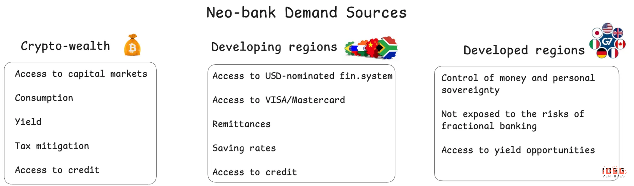 a。 加密货币持有者希望接入资本市场、消费选择、生息机会、税务优化和信贷服务。Etherfi在这一类别中已经领先,但在接入资本市场、收益生息和信贷产品方面仍有改进空间。 b。发展中地区需要获取美元计价金融系统、Visa/Mastercard网络、汇款渠道、有竞争力的储蓄利率和信贷。Redotpay目前在东南亚领先,利用加密基建提供类似Revolut的产品。其他地区存在本地化解决方案和能提高用户留存的小额贷款产品的巨大机会。 c。发达地区由于现有金融基础设施完善,机会看起来没那么明显。然而,如前所述,全球领导格局的不确定性上升可能推动这些用户转向替代方案。这创造了一个三重市场机会,Neobanks可以利用同一套底层稳定币基础设施服务根本不同的客户需求。