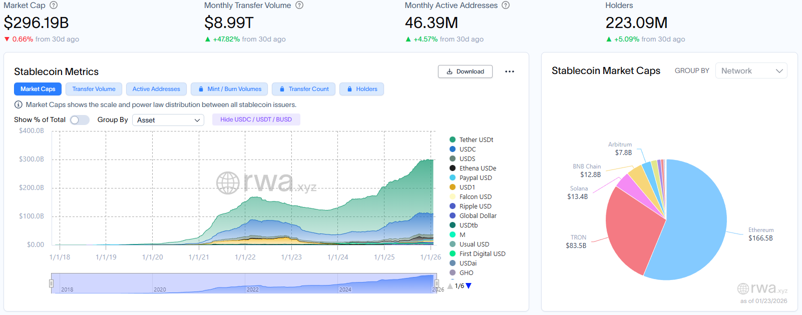 本周链上RWA总市值稳健增至225.9亿美元,持有者突破64万,增长仍由用户扩张驱动;稳定币总市值微降至2961.9亿美元,而月度转账量飙升至8.99万亿美元,周转率跃升至30.3倍,市场进入存量高周转阶段,增量资金放缓。