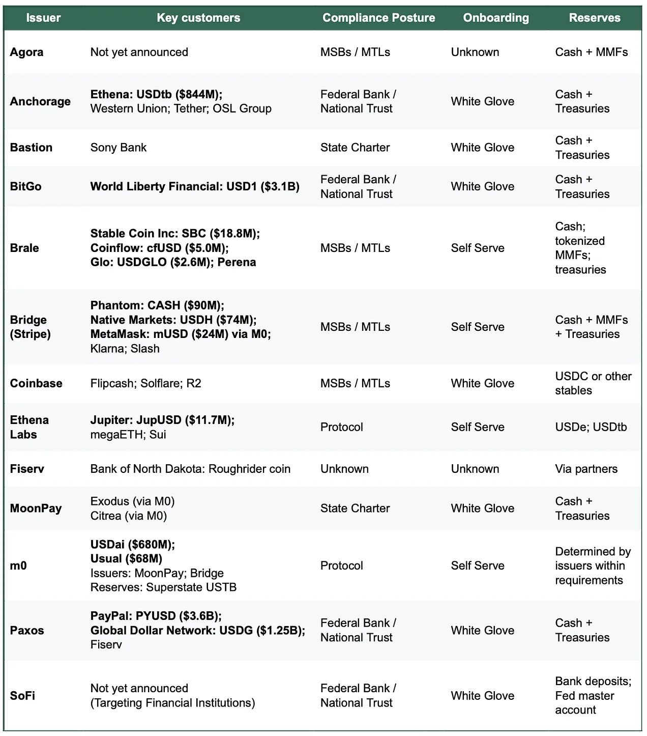 支撑这一转变的,是 “稳定币发行即服务” (issuance-as-a-service)平台的爆发式增长。几年前,市场上的首选几乎只有 Paxos;而如今,根据项目类型不同,已经出现了 10 条以上可行路径,包括 Bridge、MoonPay 这样的新平台,以合规优先著称的 Anchorage,以及 Coinbase 这样的行业巨头。