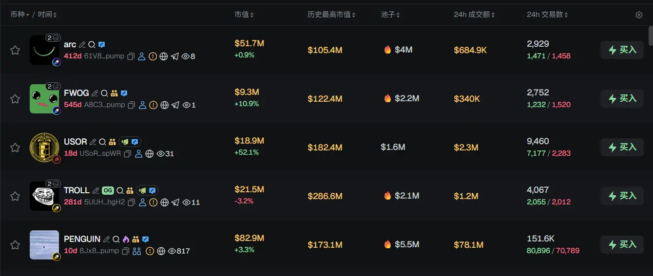 过去 24h Solana 热门代币前五依次为:arc、FWOG、USOR、TROLL、PENGUIN