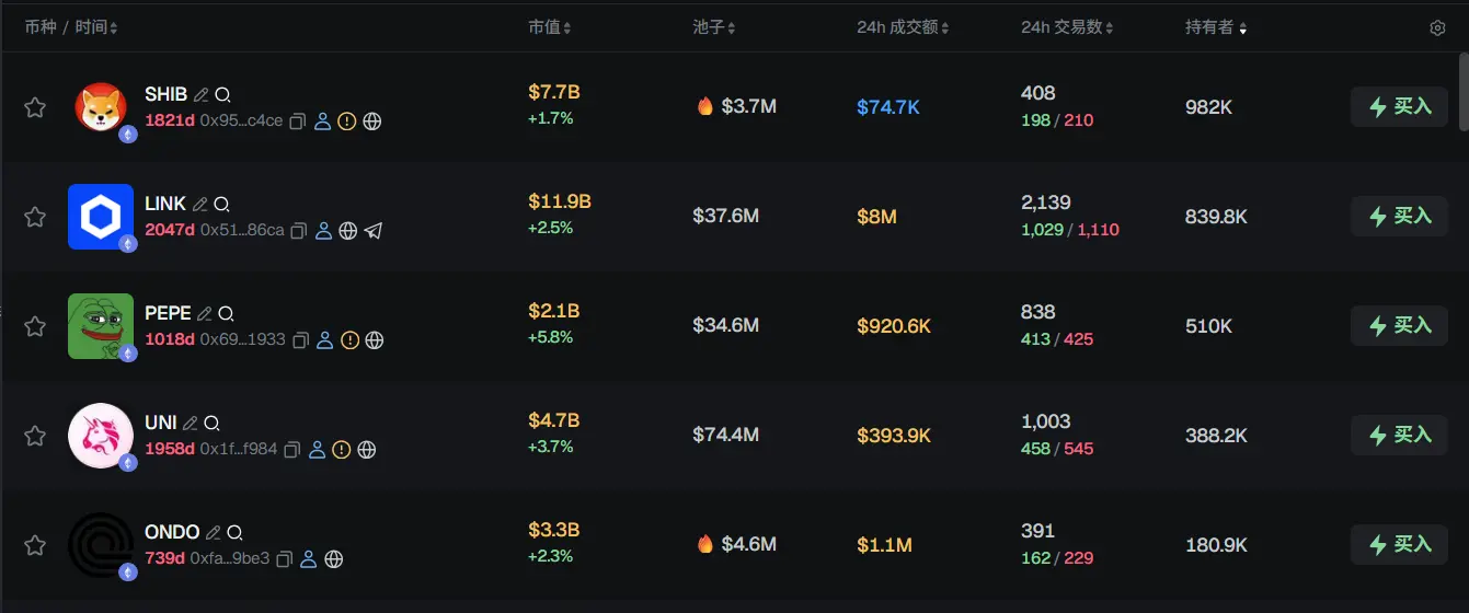 过去 24h ETH 热门代币前五依次为:SHIB、LINK、PEPE、UNI、ONDO