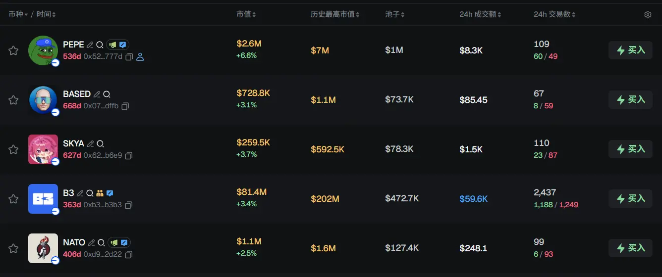 过去 24h Base 热门代币前五依次为:PEPE、BASED、SKYA、B3、NATO