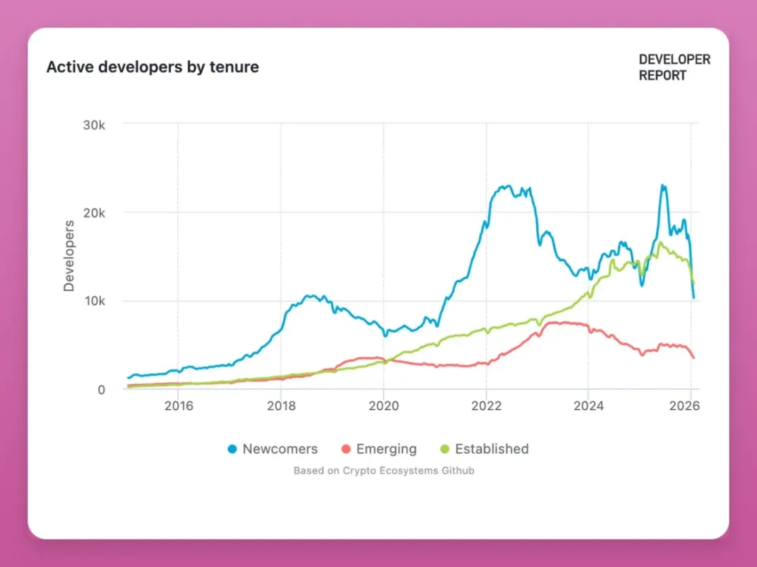 此次开发者数量下滑,主要是兼职开发者和新入门开发者离场所致。2024-2025 年的市场周期中,大批开发者涌入行业,试图通过空投和代币激励快速获利,而当这些红利消失,他们便选择离开。